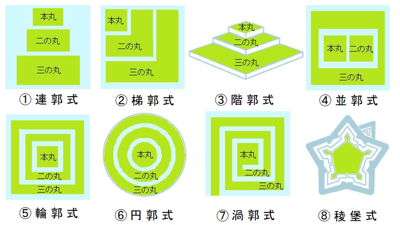 【曲輪】(くるわ) 堀、石垣、土塁、塀などで分かたれた城郭内の区画のことです。形状や場所、使用目的等により、本曲輪、腰曲輪、帯曲輪、鍛冶曲輪、山里曲輪など様々な名称で呼ばれていました。しかし、1590年代ころから「曲輪」ではなく「丸」が多く使われるようになっていきます。その中で、天守や御殿のある中枢区画を「本丸」、城主やその家族等の住居や重要施設のある区画を「二の丸」、それらを取り囲んだ防御施設のある区画を「三の丸」と呼ぶようになりました。その配置によって、以下の形式に分類されています。