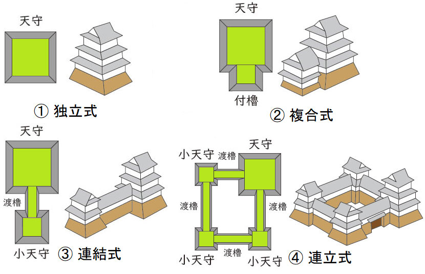 【チャシ】(ちゃし)アイヌ語で、囲い、砦、館、柵を意味する言葉です。河川,海,湖沼などの自然地形を利用し、堀や土塁をもって、円形、半円形、方形などに区画されていて、数百uから千uくらいの広さです。北海道、東北地方、サハリン(樺太)に遺構として残されていて、北海道だけでも、100箇所以上あるとされています。 【天守(閣)】(てんしゅ) 城郭の中枢部(本丸が多いが二の丸などの場合もある)に建造された、普通3層以上(2層の場合もある)の建物で、城の象徴ともなっています。戦闘時には、望楼や司令塔の役割を果たし、籠城時には、最後のよりどころともなりました。古代からの望楼の発達したものと考えられ、室町時代の末期頃から建てられたと思われ、古くは、殿主、殿守、天主とも書いたといわれています。狭間や石落などの防御機能を備え、接見、物見、貯蔵等の機能もあわせもっていたと考えられています。江戸時代には、100以上の天守があったとされていますが、幕末明治維新期に多くが失われ、大正時代までには、20になってしまいました。さらに、太平洋戦争とその後の火災で8つ失われ、現存するのは、12となっています。それ以外に戦後、鉄筋コンクリート造で外観復元されたものや木造で復元されたものもあります。